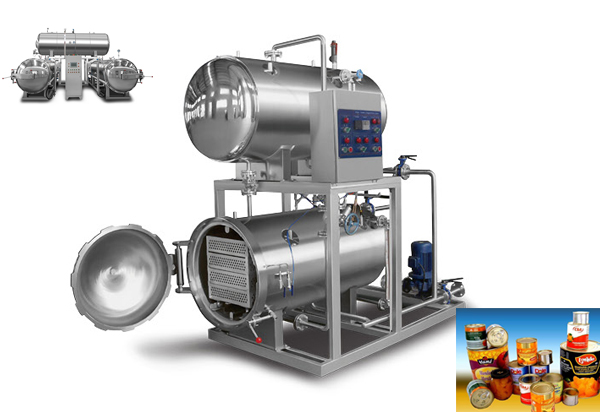 一般食品厂会对包装好的产品作常压水煮加热杀菌处理时都采用本形式的杀菌锅,电汽两用高温高压杀菌锅设备通过引入压缩空气实现了反压杀菌。冷却的话需要在锅内进行,要用水泵打入锅顶部的喷水管中(或采用水循环系统)。在杀菌的时候,由于加热使温度升高,所以包装袋内的压力会超过袋外的压力。