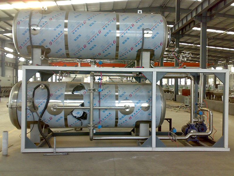 包括锅身、锅盖、弯臂装置、安全连锁装置、轨道、密封圈、蒸汽、喷管、冷却水管、管道、保压装置及闸阀等。气垫密封式杀菌锅的密封装置采用国内 技术配置,整机设计合理,运行安全可靠,结构紧凑,具有操作容易,维修方便、安装简单等特点。保压采用自动控制装置,当压力超限时可以自动进行调节,以保证容器在允许范围内正常工作。